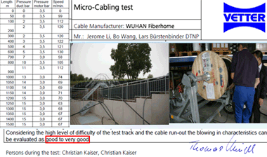 烽火科技新開發(fā)出的96芯氣吹微纜的外徑僅為6.0mm。微纜的氣吹性能得到國外專業(yè)的氣吹測試機構(gòu)VETTER的認(rèn)證,具有氣吹效果優(yōu)良,氣吹距離一次可達1.5公里以上,平均速度可達80m/min。