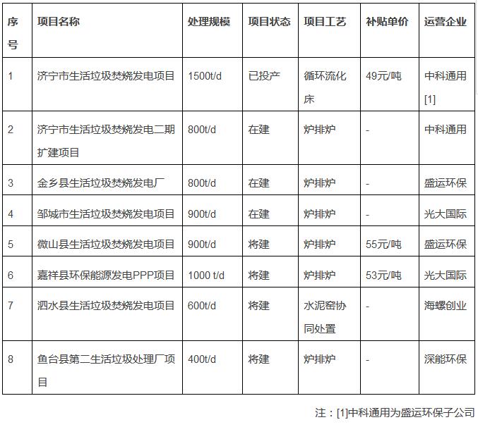 濟寧市首座生活垃圾焚燒發(fā)電廠已于2012年7月建成投產(chǎn),采用循環(huán)流化床工藝,日處理垃圾1500噸。另有兩座生活垃圾焚燒發(fā)電廠在建,分別是金鄉(xiāng)縣生活垃圾焚燒發(fā)電項目,預(yù)計今年下半年投產(chǎn);鄒城市生活垃圾焚燒發(fā)電項目,2016年9月開工,計劃2017年年底建成投用,目前尚未得到竣工消息;擬建項目除本項目外,微山縣投資約3億元建設(shè)生活垃圾焚燒發(fā)電項目,已于今年2月公布公告,將由盛運環(huán)保投資、建設(shè)并運營。同時規(guī)劃建設(shè)的還有泗水縣生活垃圾焚燒發(fā)電項目、魚臺縣生活垃圾焚燒發(fā)電項目和嘉祥縣生活垃圾焚燒發(fā)電項目,其中泗水項目目前仍處招標(biāo)階段,魚臺項目已由深能環(huán)保簽約,嘉祥項目則由光大國際中標(biāo)。