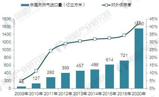 圖表 4:2009-2020 年我國天然氣進口量及對外依存度(單位:億立方米,%)