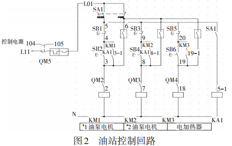 (3)2 臺油泵、加熱器控制回路及熱控電源共用一路控制電源,控制回路見圖 2??刂葡鋬劝l(fā)生控制回路接地、短路造成控制電源開關 QM5 跳閘或回路松動、斷線故障等故障時,控制電源失電將導致兩臺油泵全停,輔機跳閘。
