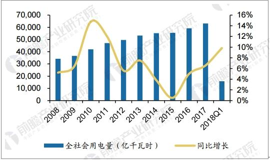 在經(jīng)歷了2015年的全社會用電量增長停滯之后,用電需求增速開始穩(wěn)步提升,根據(jù)國家能源局統(tǒng)計,2017年全社會用電量6.31萬億千瓦時,同比增長6.57%,2018年第一季度用電量為1.59萬億千瓦時,單季度同比增長達(dá)9.83%。