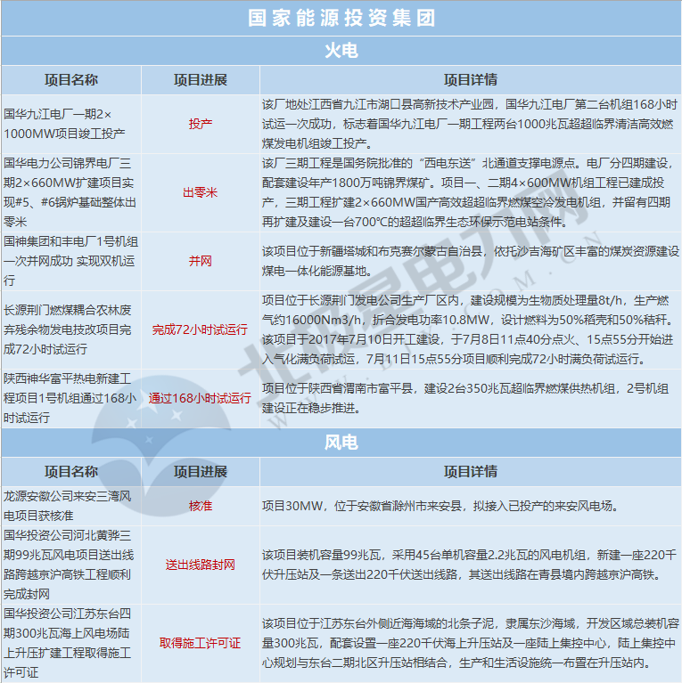 國家能源投資集團涉及電力項目11個,其中火電、風電項目各5個,水電項目1個;