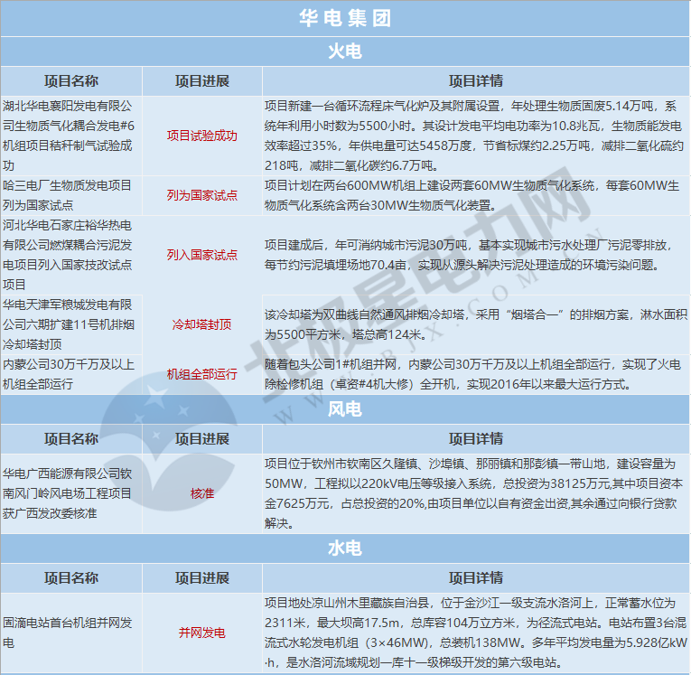 華電集團涉及電力項目7個,其中火電項目5個,風電、水電項目各1個;