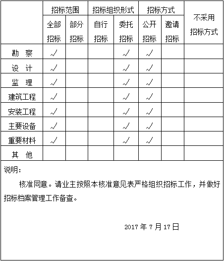 六、請嚴(yán)格按照本文核準(zhǔn)意見實(shí)施招標(biāo)。招標(biāo)范圍、招標(biāo)組織形式、招標(biāo)方式等要求見《招標(biāo)核準(zhǔn)意見表》(附后)。