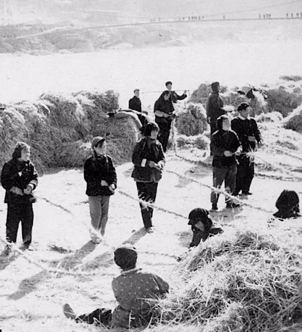 職工為草土圍堰施工打草繩