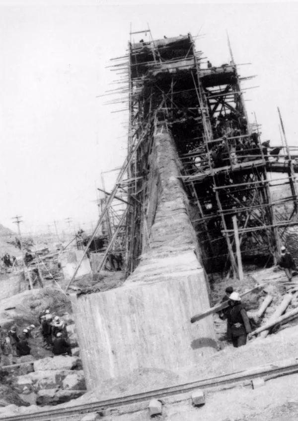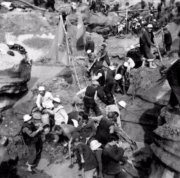 工程基礎開挖分為兩期,一期1959年4月截流前,為右岸基礎開挖階段;二期截流后至1960年底,為左岸基礎開挖階段?;疽允止ら_挖為主,主體共開挖石方49.39萬立方米,電站全部土石方開挖達96萬立方米。而這其中絕大部分都是依靠工人手中的大錘、鋼釬、鐵鍬完成的。