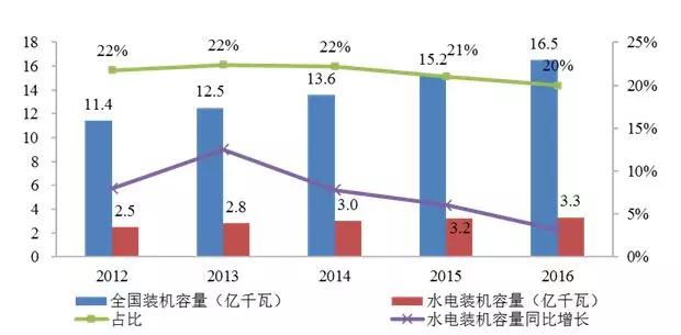 ▲全國全口徑發(fā)電裝機(jī)容量及水電裝機(jī)容量狀況