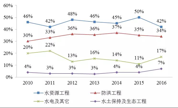 按投資用途分析,水資源工程和防洪工程是水利建設(shè)的重點(diǎn)項(xiàng)目工程,從近七年分用途完成投資額的占比情況來看,水資源工程基本占據(jù)所有投資的一半。2016年水資源工程和防洪工程投資占比有所下降,水電和水土保持及生態(tài)工程投資有所增加。