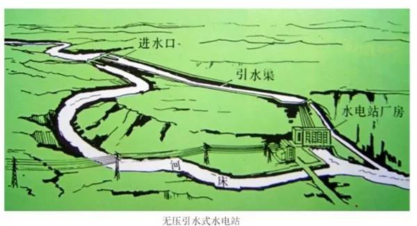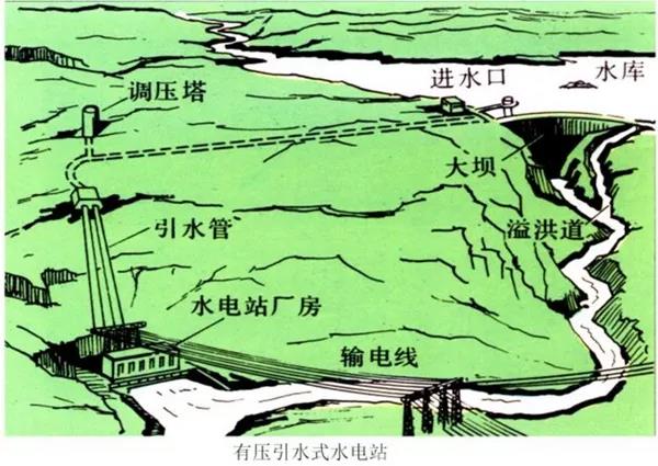 在河流坡降陡的河段上筑一低壩(或無壩)取水,通過人工修建的引水道(渠道、隧洞、管道)引水到河段下游,集中落差,再經(jīng)壓力管道引水到水輪機進(jìn)行發(fā)電。用引水道集中水頭的電站稱為引水式水電站。