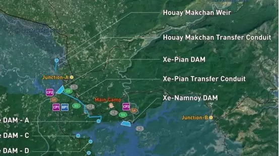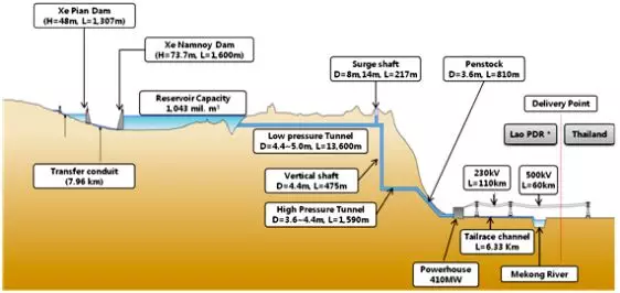 該工程由PNPC公司(Xe-Pian Xe-Namnoy Power Company)投資,2013年2月開始建設(shè),計劃2019年投產(chǎn)發(fā)電。PNPC公司是韓國SK建設(shè)株式會社(SKEC,持股26%)、泰國Ratchaburi發(fā)電公司(RATCH,持股25%)、韓國西部電力(KOWEPO ,持股25%)和老撾控股國有企業(yè)(LHSE,持股24%)于2012年3月組成的合資企業(yè)。該項目投資約10.2億美元,PNPC公司與老撾政府簽署了特許經(jīng)營協(xié)議,電站投入商業(yè)運營后特許經(jīng)營27年,370MW的電力將出售給泰國電力公司(EGAT),40MW的電力將出售給老撾電力公司(EDL)。