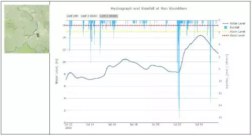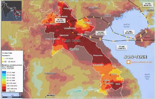 總體上看,季風(fēng)季節(jié)以及熱帶風(fēng)暴Son-Tinh過境引起的持續(xù)強降雨是導(dǎo)致洪水和潰壩發(fā)生的直接原因。全球災(zāi)害預(yù)警與協(xié)調(diào)系統(tǒng)(GDACS, Global Disaster Alerting Coordination System)曾于2018年7月15日發(fā)布Son-Tinh熱帶風(fēng)暴暴雨橙色預(yù)警,受影響區(qū)域包括菲律賓、中國、越南和老撾等地區(qū)。距離受災(zāi)區(qū)域不遠(yuǎn)的Ban Veunkhen水文站點數(shù)據(jù)(圖10)顯示,隨著Son-Tinh熱帶風(fēng)暴7月20-21日過境導(dǎo)致的強降雨(7月15日-24日累計降雨量見圖10),河道水位快速上漲,7月24日達(dá)到峰值。