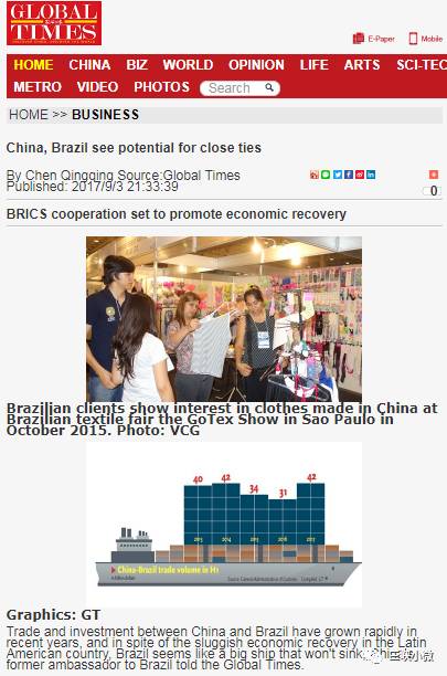 《環(huán)球時(shí)報(bào)》在《中巴未來將緊密合作——金磚國家攜手推動(dòng)經(jīng)濟(jì)復(fù)蘇》一文中指出,中巴建交43年以來,在貿(mào)易、科技、航空航天等領(lǐng)域取得了重大進(jìn)展,中巴之間的貿(mào)易和投資快速增長。2017年上半年,中巴雙邊貿(mào)易額達(dá)到420億美元,同比增長35%。今年5月,中國和巴西政府共同成立了“中巴擴(kuò)大產(chǎn)能合作基金”,初始投資200億美元,用于推動(dòng)中巴雙方開展產(chǎn)能合作。《北京周報(bào)》在報(bào)道中也提到,近年來中巴經(jīng)濟(jì)聯(lián)系愈發(fā)緊密。中國已連續(xù)七年保持巴西最大貿(mào)易伙伴地位,超過200家中國企業(yè)在巴西的電訊、能源、機(jī)械制造等領(lǐng)域開展業(yè)務(wù)。
