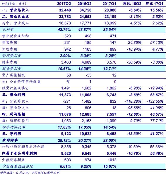 2017年二季度水電行業(yè)同比業(yè)績下滑。2017年二季度,水電行業(yè)實現(xiàn)營業(yè)總收入324.5億元,同比下滑6.6%,環(huán)比上升15.6%;歸屬凈利潤85.2億元,較去年同期下滑10.8%,環(huán)比提高56.5%;扣非凈利83.6億元,同比減少10.6%,環(huán)比提高55.4%。與去年同期相比,水電毛利率同比減少6.1個百分點、環(huán)比提升7.2個百分點至42.8%;凈利率同比下降2.2個百分點,環(huán)比增加5.1個百分點達(dá)到28.1%。
