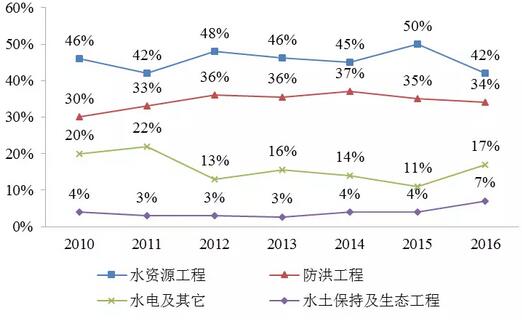 按投資用途分析,水資源工程和防洪工程是水利建設(shè)的重點項目工程,從近七年分用途完成投資額的占比情況來看,水資源工程基本占據(jù)所有投資的一半。2016年水資源工程和防洪工程投資占比有所下降,水電和水土保持及生態(tài)工程投資有所增加。