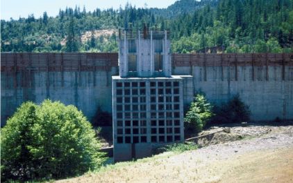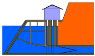 ②塔式進水口:位于水工隧洞或土石壩壩下埋管的首部,是一個不依傍山坡,獨立于水庫之中的封閉式塔或框架式塔,又稱進水塔。塔底裝設(shè)閘門,在塔內(nèi)或頂部布置啟閉機室。塔式進水口受風、浪、冰和地震的影響大,穩(wěn)定性不如豎井式,需要較長的工作橋與岸邊或壩頂連接。適用于岸坡低緩、巖石破碎或覆蓋層較厚,不宜采用靠岸進口的情況。