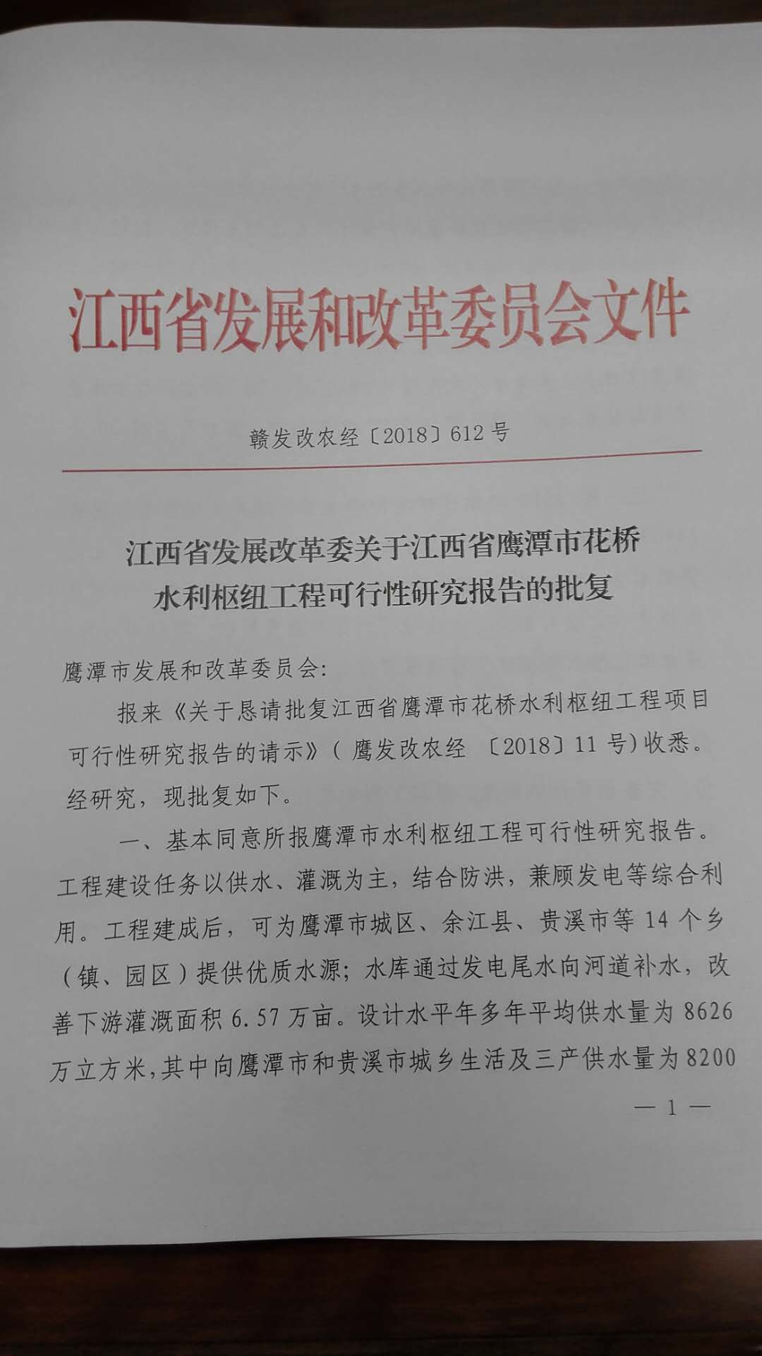 我委在市政府的高度重視和省發(fā)改委的大力支持下,期盼已久的批復(fù)《江西省鷹潭市花橋水利樞紐工程項(xiàng)目可行性研究報(bào)告》,于2018年7月2日獲省發(fā)改委批復(fù)。該項(xiàng)目總投資248164萬(wàn)元。