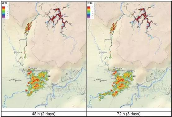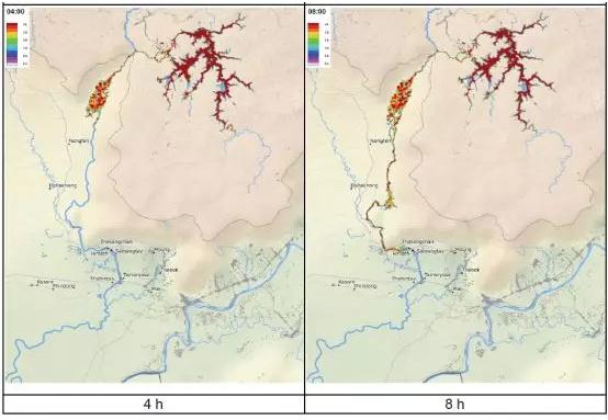 下圖為從潰壩開始,不同時(shí)間后洪水演進(jìn)的計(jì)算分析結(jié)果。