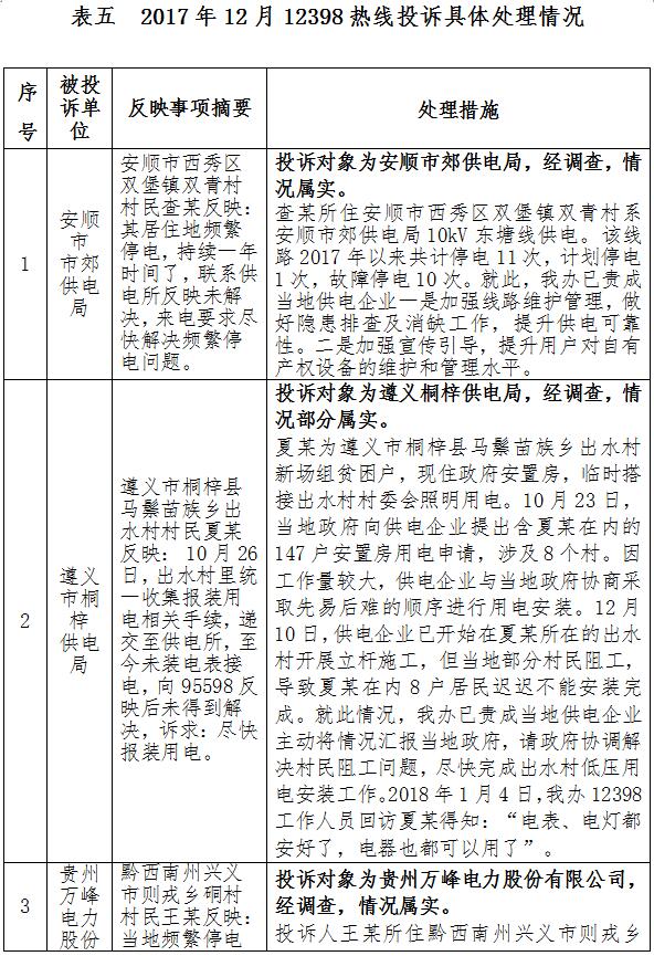 2017年12月貴州省12398能源監(jiān)管熱線投訴舉報(bào)處理情況通報(bào)