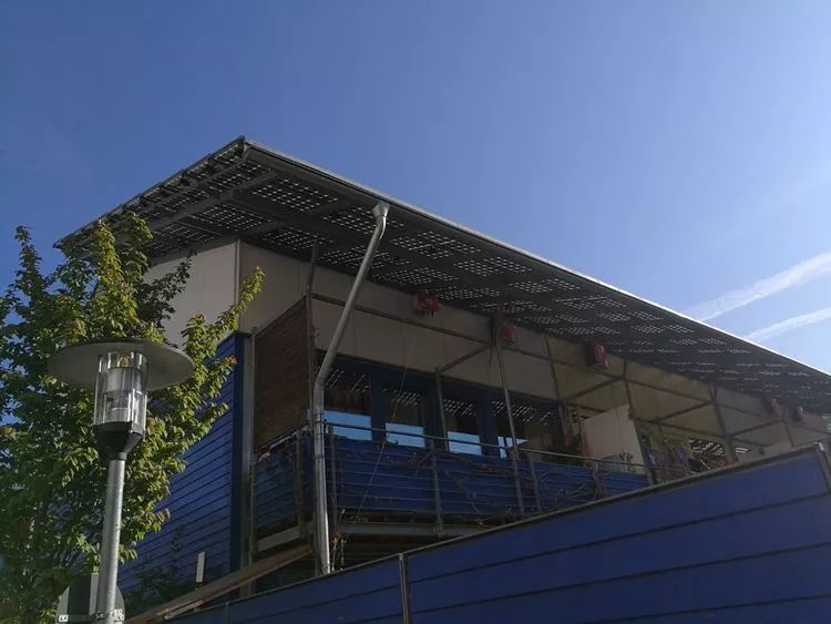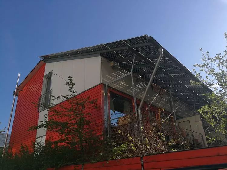 光伏板不僅在南側(cè)伸出很長,還在西側(cè)也伸出不少,這樣可以增加安裝面積。這樣的一個房子的光伏屋頂發(fā)的電,明顯要多于這幢建筑自用的電量。