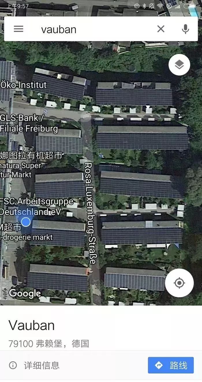 弗賴堡位于德國最西南角,鄰近法國和瑞士的地方,圖上可以看到,瑞士的蘇黎士距離很近。這里的光照資源是德國最好的地區(qū)之一。
