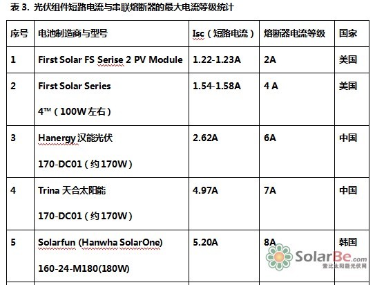 根據(jù)表3可知,由于光伏電池板制造工藝的不同,導(dǎo)致短路電流的差異性很大。所以在選擇過(guò)電流保護(hù)裝置時(shí),由于熔斷器的電流等級(jí)具備以下額定電流等級(jí):