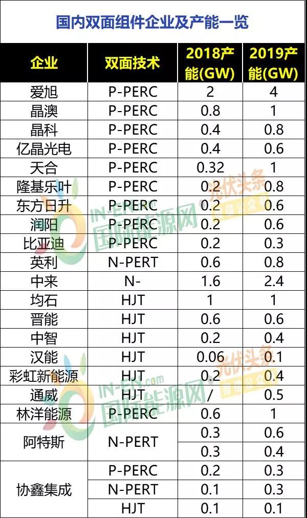 全球共有40家光伏企業(yè)生產(chǎn)雙面組件,國(guó)內(nèi)生產(chǎn)企業(yè)有晶澳、晶科、億晶、天合、隆基、東方日升等17家。2018年全球雙面組件規(guī)劃產(chǎn)能超過(guò)15GW(若以第四季廠商開始投入生產(chǎn),實(shí)際產(chǎn)能約為3.75GW)。預(yù)估2019年雙面組件規(guī)劃產(chǎn)能可達(dá)25.74GW,為雙面組件成長(zhǎng)年。