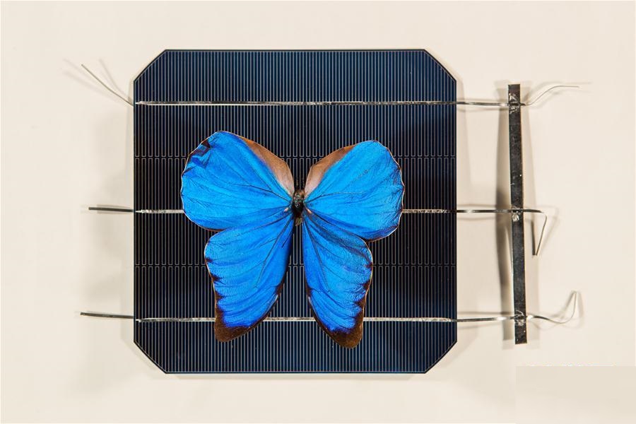 5月16日,在位于澳大利亞堪培拉的澳大利亞國(guó)立大學(xué),研究人員之一、澳大利亞國(guó)立大學(xué)的凱文·黎拿著一只歡樂(lè)女神閃蝶和一塊太陽(yáng)能電池板。澳大利亞國(guó)立大學(xué)17日發(fā)布一項(xiàng)公告稱,受蝴蝶翅膀啟發(fā),該校研究人員發(fā)明