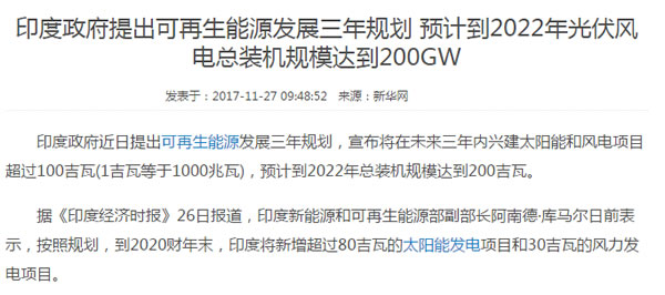 整個印度,人口和我們中國不相上下,但其電力總裝機量在400Gw左右,而我國的總裝機量約2000Gw,大家可以想想這個差距有多大,而這是一個十分巨大的市場。而光伏在印度,已經(jīng)是最廉價的能源之一了,同時印度政府也在2014年的提出了2020年要建造100Gw的光伏電站,同時,也在近期又進一步提出在2022年要將光伏與風電的總規(guī)模達到200Gw的目標: