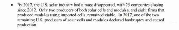 在2017年,美國的光伏制造業(yè)幾乎已經(jīng)消失,從2012年開始有25家美國光伏制造業(yè)關(guān)門/倒閉。在2017年,整個美國僅有兩家公司制造太陽能電池和組件,有8家公司制造組件,但用的是進口的太陽能電池。結(jié)果很慘的是,在2017年調(diào)查的過程中,上面僅有的兩家制造太陽能電池和組件中的一家公司,宣布了破產(chǎn)。