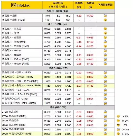 我們看到,正是在這樣的政策環(huán)境下,疊加短期的供應需求關(guān)系(中國也是傳統(tǒng)的淡季),目前光伏各個環(huán)節(jié)的價格,出現(xiàn)了下滑,其中下滑最厲害的便是電池片環(huán)節(jié)。根據(jù)PVInfoLink的價格顯示: