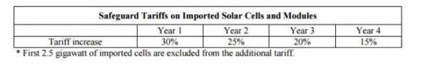 其中,對進口產(chǎn)品的保障關(guān)稅將執(zhí)行4年,首年稅率為30%,隨后年降5%,至2021年稅率將為15%。