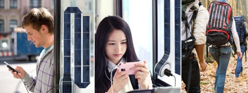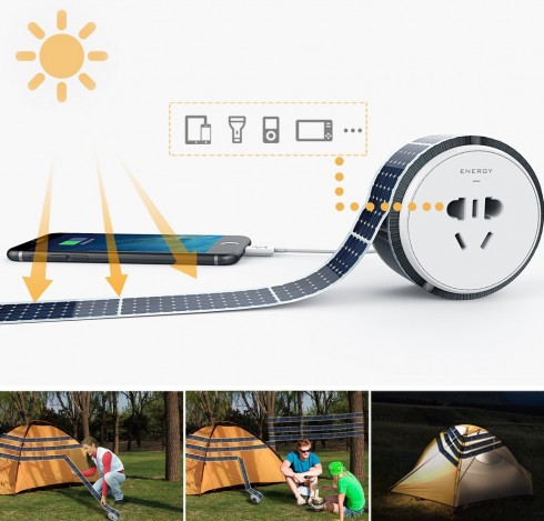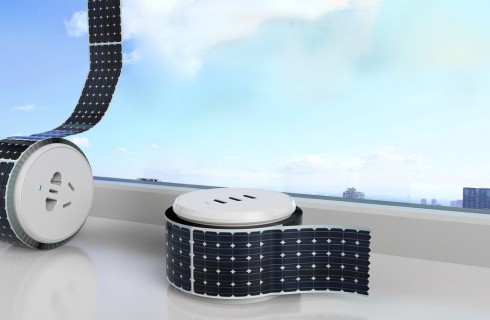 用超薄的柔性太陽能電池板,像封箱帶一樣繞成一卷,末端是一個(gè)圓形的插座,于是,需要的時(shí)候,我們可以非常方便地將電池板拉出來鋪在地上、纏在帳篷上,瞬間就能誕生一個(gè)不錯(cuò)的太陽能發(fā)電站。
