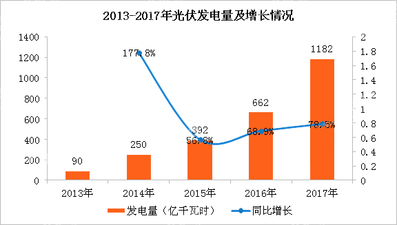 從發(fā)電情況來看:2017年,全國光伏發(fā)電量1182億千瓦時,同比增長78.6%,光伏發(fā)電量占全部發(fā)電量的比重由2016年的1.1%提高到1.8%。