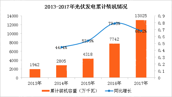 到2017年12月底,全國光伏發(fā)電裝機(jī)達(dá)到1.3億千瓦,其中,光伏電站10059萬千瓦,分布式光伏2966萬千瓦。而此前太陽能“十三五”規(guī)劃的目標(biāo)僅105GW,已經(jīng)提前并超額完成了“十三五規(guī)劃目標(biāo)”。“十三五”以來,隨著太陽電池技術(shù)進(jìn)步的快速提高,太陽電池生產(chǎn)成本和光伏發(fā)電成本快速下降,在各項光伏政策的支持下,我國光伏發(fā)電市場繼續(xù)保持快速發(fā)展。