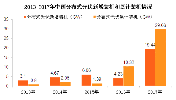 受上網(wǎng)電價調(diào)整等多重因素影響,2017年光伏發(fā)電市場規(guī)??焖贁U(kuò)大,新增裝機(jī)5306萬千瓦,其中,光伏電站3362萬千瓦,同比增加11%;分布式光伏1944萬千瓦,同比增長3.7倍。2017年我不哦分布式光伏累計裝機(jī)2966萬千瓦,其中,分布式光伏新增裝機(jī)1944萬千瓦。