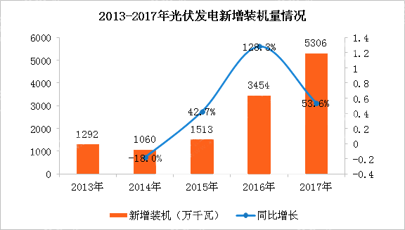 據(jù)統(tǒng)計,2014-2015年我國光伏發(fā)電新增裝機(jī)量逐年穩(wěn)步上漲,特別是2016年我國光伏發(fā)電新增裝機(jī)容量3454萬千瓦,同比增長高達(dá)128.3%。初步計算,2017年光伏發(fā)電的新增裝機(jī)還是2016年的1.5倍、2015年的3.5倍、2014年的5陪和2013年的4倍,由此可見2017年光伏新增裝機(jī)出現(xiàn)了大幅快速增長。
