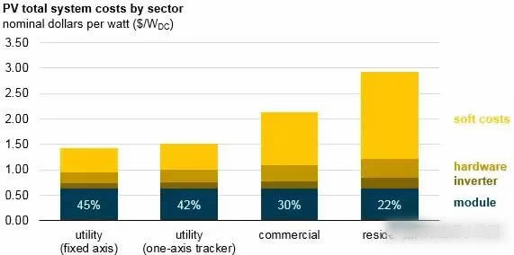 根據(jù)美國可再生能源實驗室(NREL)的數(shù)據(jù),2017年美國家庭屋頂光伏系統(tǒng)的組件成本占系統(tǒng)成本的22%;商業(yè)建筑光伏系統(tǒng)的組件成本占30%;而大型地面光伏系統(tǒng)的組件成本在42%-45%之間??梢?,在家庭光伏系統(tǒng)中,組件只是總成本的五分之一強,而在大型光伏電站中光伏組件的成本也不到50%。