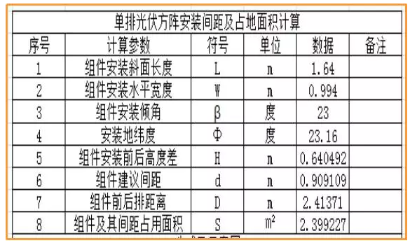 組件前后排間距:間距應(yīng)能保證冬至日早上9點至下午3點太陽能電池方陣不被遮擋。通過使用EXCEL表公式計算,選擇緯度、組件寬度、長度、傾角即可計算出合適間距。以廣州地區(qū)(北緯23°)為例:
