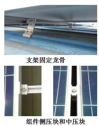 組件: 組件的鋁合金邊框與支架進行連接,再通過引下線完成可靠接地。