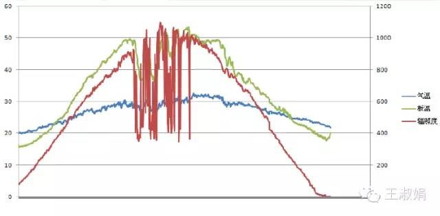 上圖中,電池板溫度(綠線)最多的時(shí)候能比環(huán)境溫度(藍(lán)線)高出25℃。據(jù)文獻(xiàn)介紹,在青海正午輻照度最好的時(shí)間,電池板溫度甚至能比環(huán)境溫度高出近30℃。