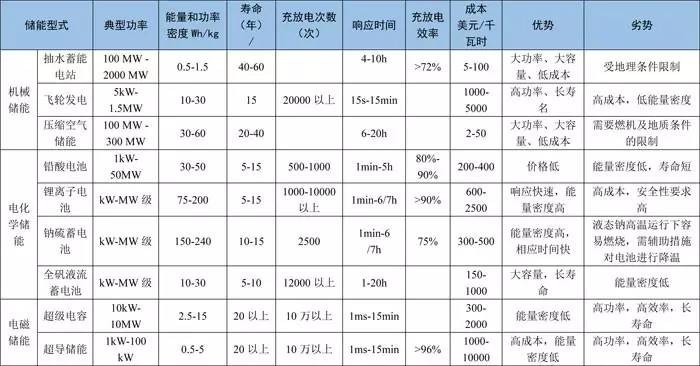 下面對(duì)不同形式的儲(chǔ)能的性能作了如下分析總結(jié):