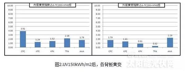 UV150kWh/m2(60℃-試驗(yàn)箱內(nèi)空氣溫度,輻照度45W/m2):UV試驗(yàn)時(shí),背板外層對(duì)著紫外燈。在UV150kWh/m2后(圖2),涂覆型背板的內(nèi)層和外層均發(fā)生了顯著黃變;個(gè)別PVDF膜,如試驗(yàn)的KPK背板的內(nèi)層PVDF層,也發(fā)生了顯著黃變;而特能(Tedlar)膜和較好的PVDF膜,無明顯黃變;KPE內(nèi)層E層及AAA背板,也無明顯黃變。之所以背板外層對(duì)著紫外燈,而背板內(nèi)層仍然發(fā)生黃變,是由于試驗(yàn)箱中,紫外燈燈管沿箱子一側(cè)的箱壁從上之下依次裝配,背板材料只能也采取外層面向紫外燈管從上至下依次懸掛放置,而背板另一側(cè)的箱壁(不銹鋼制作)會(huì)不可避免反射紫外線至背板的內(nèi)層,如此造成背板內(nèi)層黃變現(xiàn)象的發(fā)生??傮w而言,加強(qiáng)UV輻照下,涂覆型背板的涂層和一些PVDF膜,容易發(fā)生黃變,特能(Tedlar)膜則表現(xiàn)較好。
