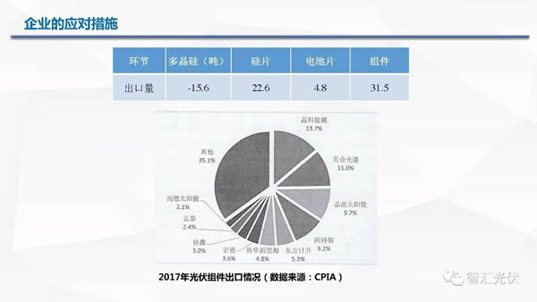 2017年,中國(guó)組件出口量達(dá)到31.5GW,而2017年全球除中國(guó)以外的海外新增裝機(jī)僅有50GW。因此,中國(guó)的組件在海外的占有率達(dá)到60%以上!