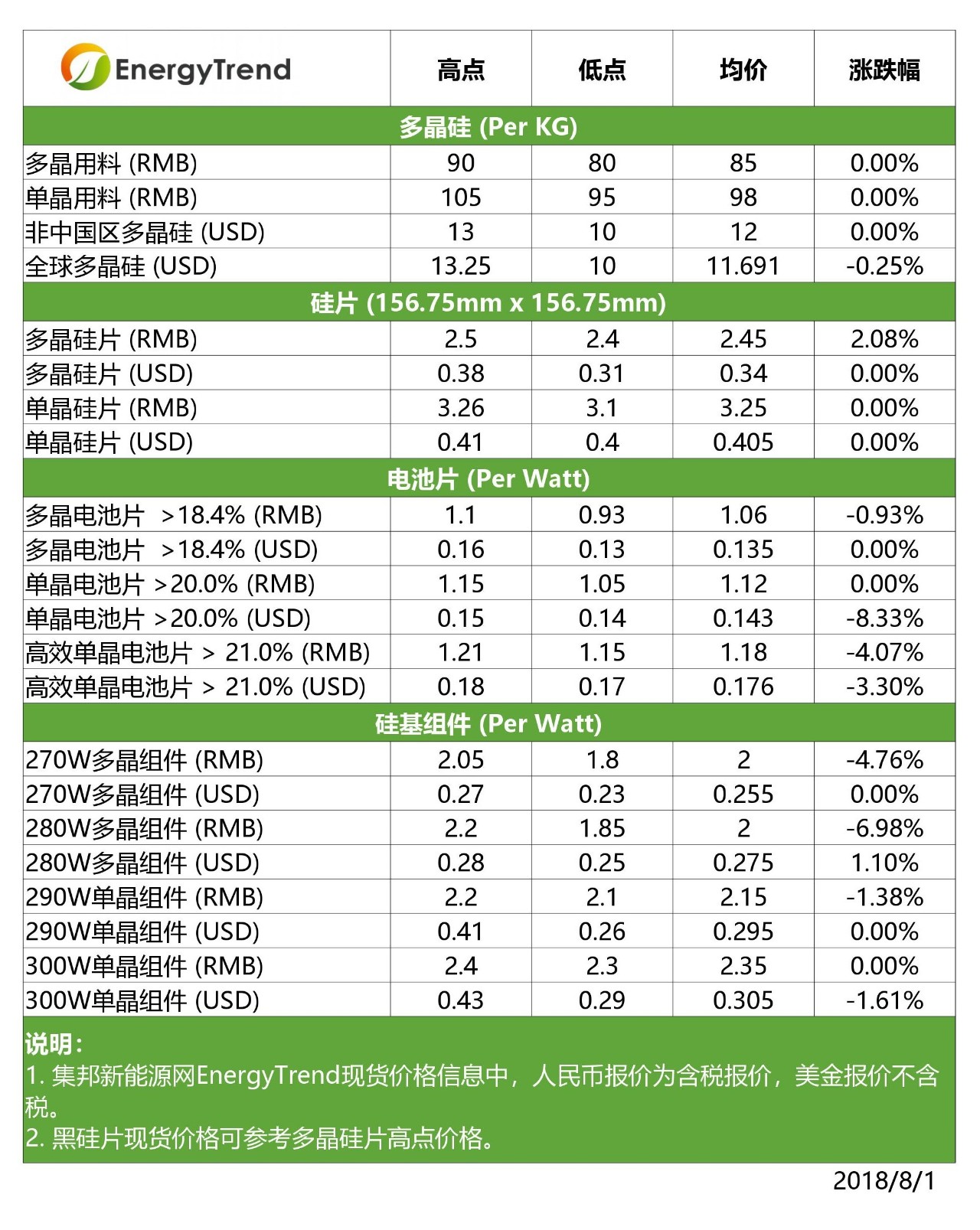 大陸國內(nèi)的一般多晶電池有光伏扶貧的需求支持,但高效多晶并無明顯行情。單晶電池則受上游的硅片調(diào)降價(jià)格,以及對(duì)于領(lǐng)跑者采購標(biāo)案將出現(xiàn)低價(jià)的預(yù)期心理影響,價(jià)格看跌。目前大陸國內(nèi)一般單晶電池價(jià)格仍維持在RMB1.05~1.15/W,高效單晶則已降至RMB1.15~1.21/W。多晶常規(guī)電池的價(jià)格為RMB0.93~1.10/W。