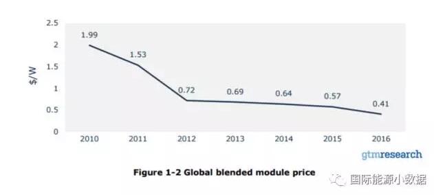 2010~2016:光伏組件平均成本從1.99美元/瓦降至0.41美元/瓦