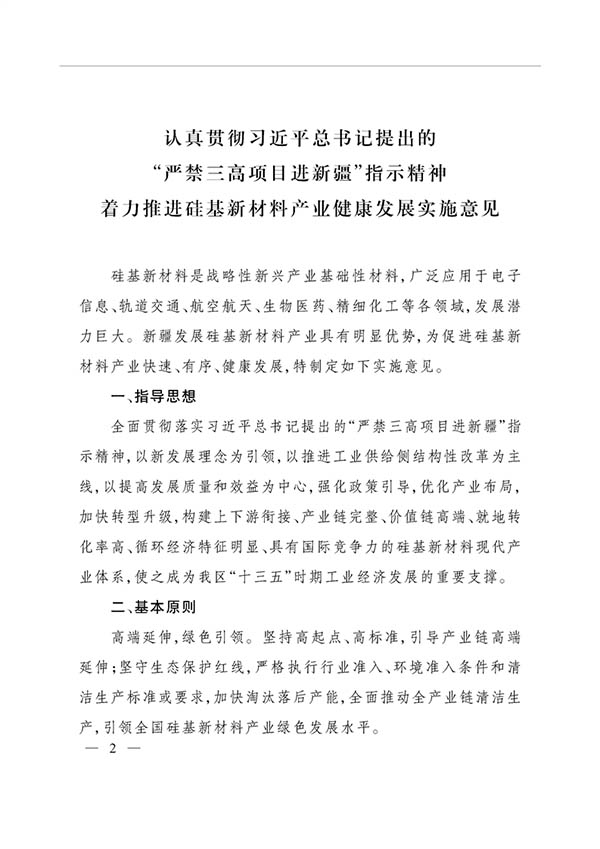 新疆印發(fā)“嚴(yán)禁三高項(xiàng)目進(jìn)新疆”指示精神 著力推進(jìn)硅基新材料產(chǎn)業(yè)健康發(fā)展實(shí)施