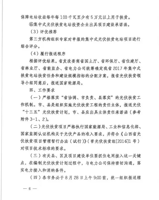 近日,山西發(fā)改委、山西扶貧辦聯(lián)合下發(fā)《關于開展我省”十三五“光伏扶貧計劃編制工作的通知》。根據通知,“十三五”光伏扶貧的主要建設模式為村級電站(包括多村聯(lián)建)和集中式電站兩種。單個村級電站容量控制在300萬千瓦左右,電網公司出具證明具備就近接入條件的,可放大至500萬千瓦。而集中式電站,能源局下達山西的2017年800MW光伏指標全部用于集中式扶貧電站,規(guī)模分配在各市縣申報初審的基礎上,委托第三方機構采用競爭評優(yōu)的方法進行。