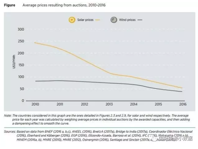 根據(jù)國(guó)際可再生能源署最新發(fā)布的《可再生能源競(jìng)價(jià)分析報(bào)告》,到2016年中已經(jīng)至少有67個(gè)國(guó)家以競(jìng)價(jià)方式確定可再生能源項(xiàng)目,而2010年時(shí)只有10個(gè)國(guó)家實(shí)行可再生能源項(xiàng)目競(jìng)價(jià)。相比固定的標(biāo)桿價(jià)格,可再生能源競(jìng)價(jià)有效地降低了可再生能源上網(wǎng)的價(jià)格。2010年,風(fēng)電合同平均價(jià)格為80美元/兆瓦時(shí)、光伏為250美元/兆瓦時(shí);而2016年風(fēng)電平均合同價(jià)下降37.5%,為40美元/兆瓦時(shí),光伏下降幅度更達(dá)到80%,為50美元/兆瓦時(shí)(相當(dāng)于人民幣0.33元/千瓦時(shí))。