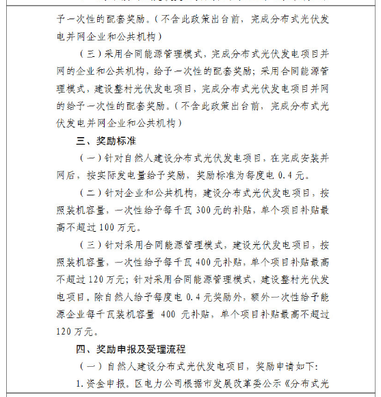 為有效促進全區(qū)節(jié)能減排,優(yōu)化能源結構,推進綠色能源替代,改善大氣環(huán)境質(zhì)量,加快實現(xiàn)建設資源節(jié)約型、環(huán)境友好型社會。區(qū)發(fā)改委出臺了《順義區(qū)分布式光伏發(fā)電項目推廣應用暫行辦法》,一是關于自然人。給予持