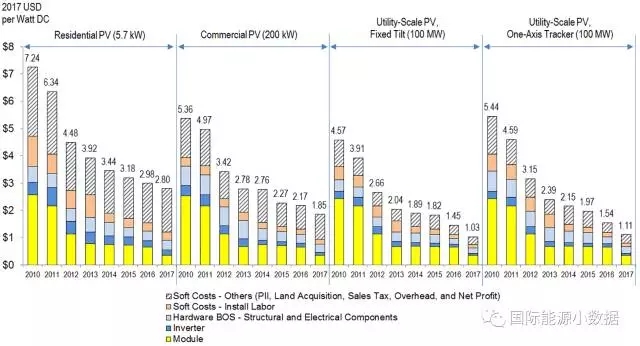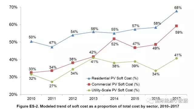 以公共事業(yè)級(大型地面)光伏為例,2010年軟成本只占總成本的32%,而2017年軟成本占到總成本的41%。2017年商用設施光伏系統(tǒng)的軟成本占59%,而家庭戶用光伏的軟成本比例更高達68%。